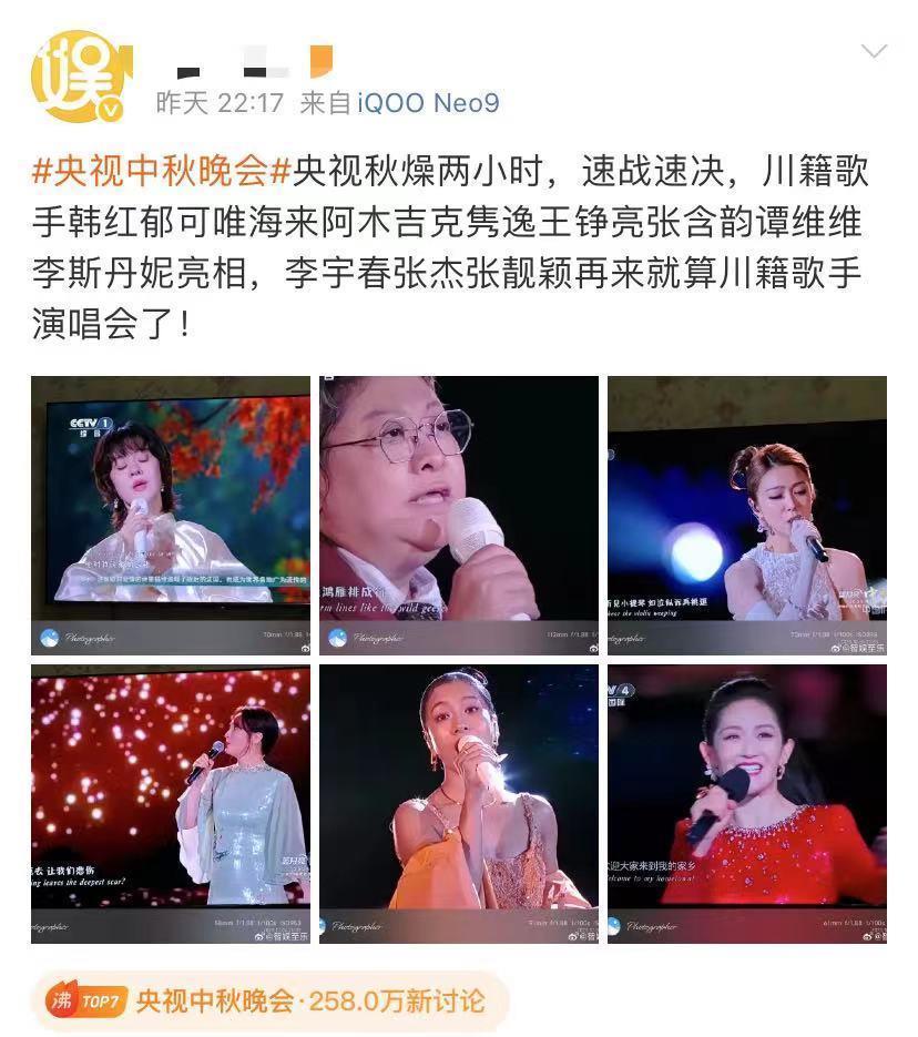节目两个多小时就结束了,邀请了很多四川籍艺人表演,比如郁可唯、韩红、海来阿木、吉克隽逸、王铮亮、张含韵、李斯丹妮,差张杰、张靓颖、李宇春等。节目安排在德阳举行,当然要给大家看四川的烟火味,所以多邀请四川的艺人表演,也是可以理解,而且他们都很红,大牌艺人没有邀请,可能档期等原因吧? 谢娜一出手,就看热搜有没有,她再次成功登上热搜,的确让那些不喜欢她的人很破防,其实谢娜都44岁了,该沉稳了,也该内敛了,当然活泼的底色没变,这很重要。 #谢娜# #谢娜主持央视中秋晚会你看好吗#